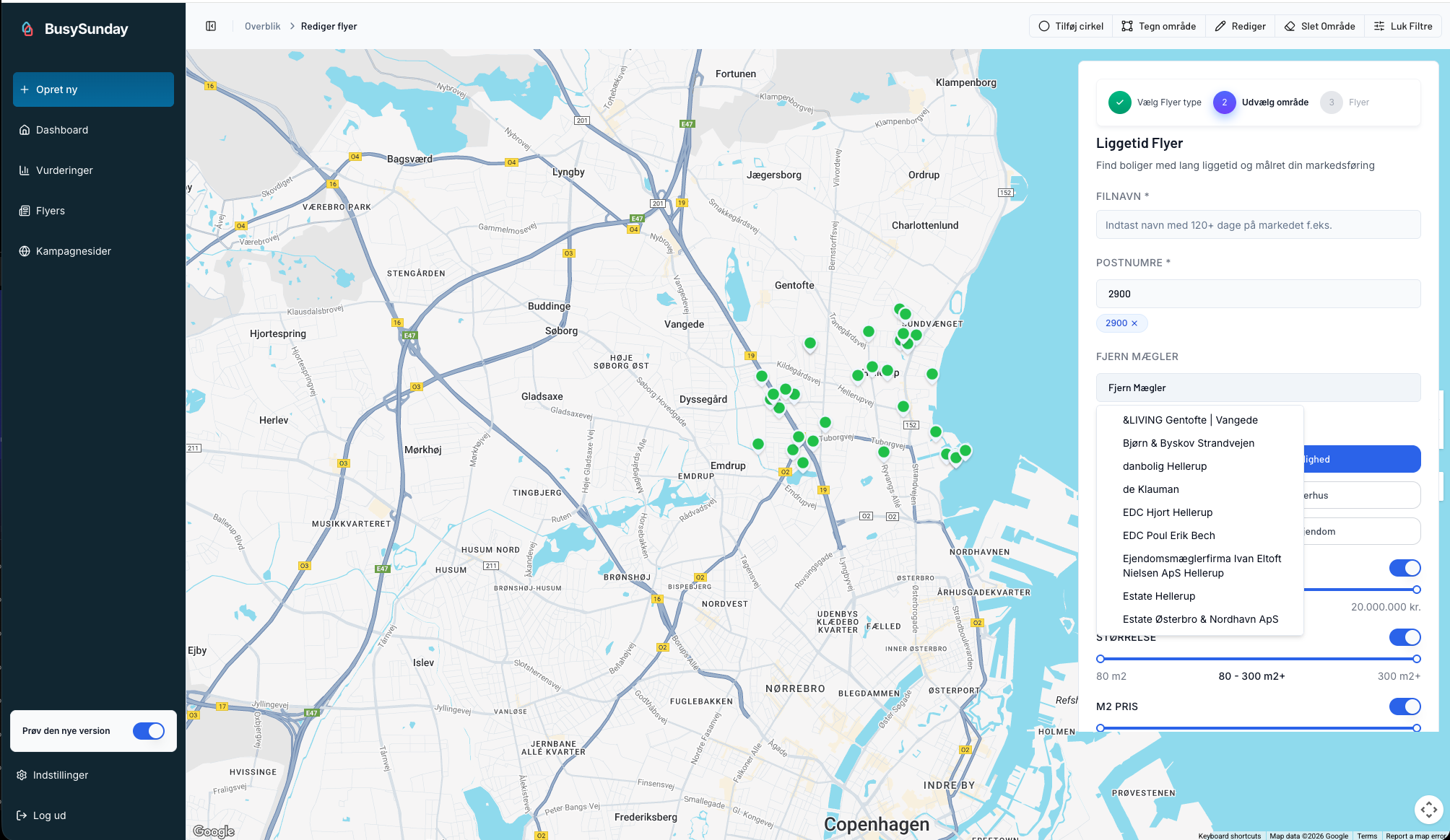 Du kan nu tegne direkte i kortet for at definere præcis det område, du vil arbejde med. I stedet for faste postnumre eller brede søgninger kan du visuelt afgrænse dit marked og målrette dine handlinger helt ned på gadeniveau.