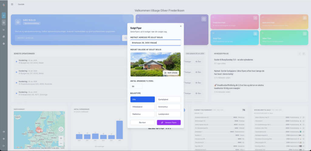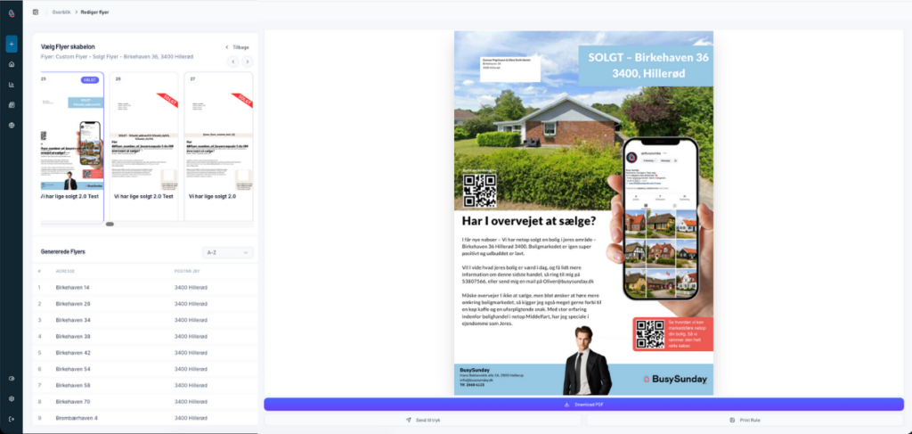Med den nye funktion kan du nemt og næsten automatisk oprette solgt-flyers. Du indtaster blot adressen på den solgte bolig – så henter platformen automatisk billedet og udfylder navn og adresse på de boliger, der skal modtage flyeren.