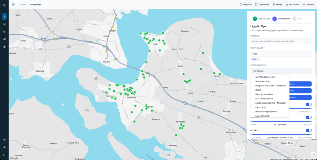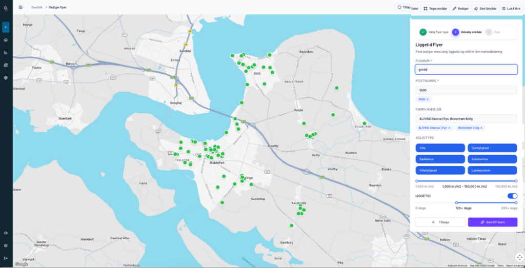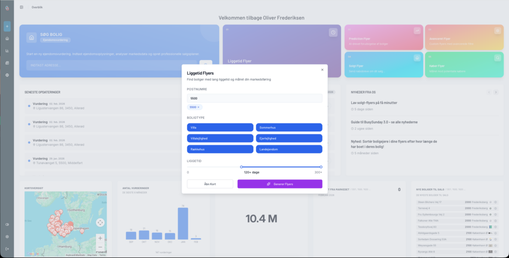 Med den nye funktion kan du nemt og næsten automatisk oprette Liggetid-flyers. Du vælger blot de ønskede kriterier – så genererer platformen automatisk flyers til de boliger, der matcher din valgte liggetid, boligtype og område.